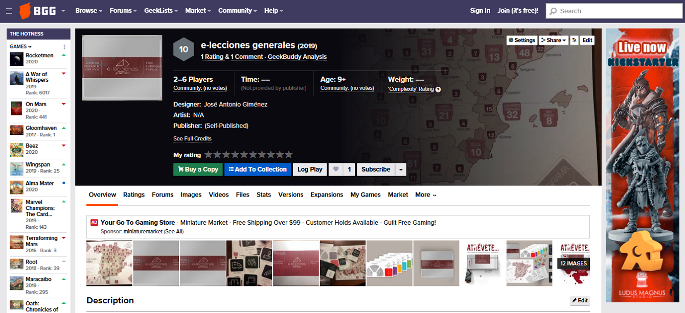 E-lecciones generales is a didactic strategy game about electoral processes, how the elections for president of the government are held in Spain, designed for games of 2 to 6 players. Recommended for players from 9 to 99 years.