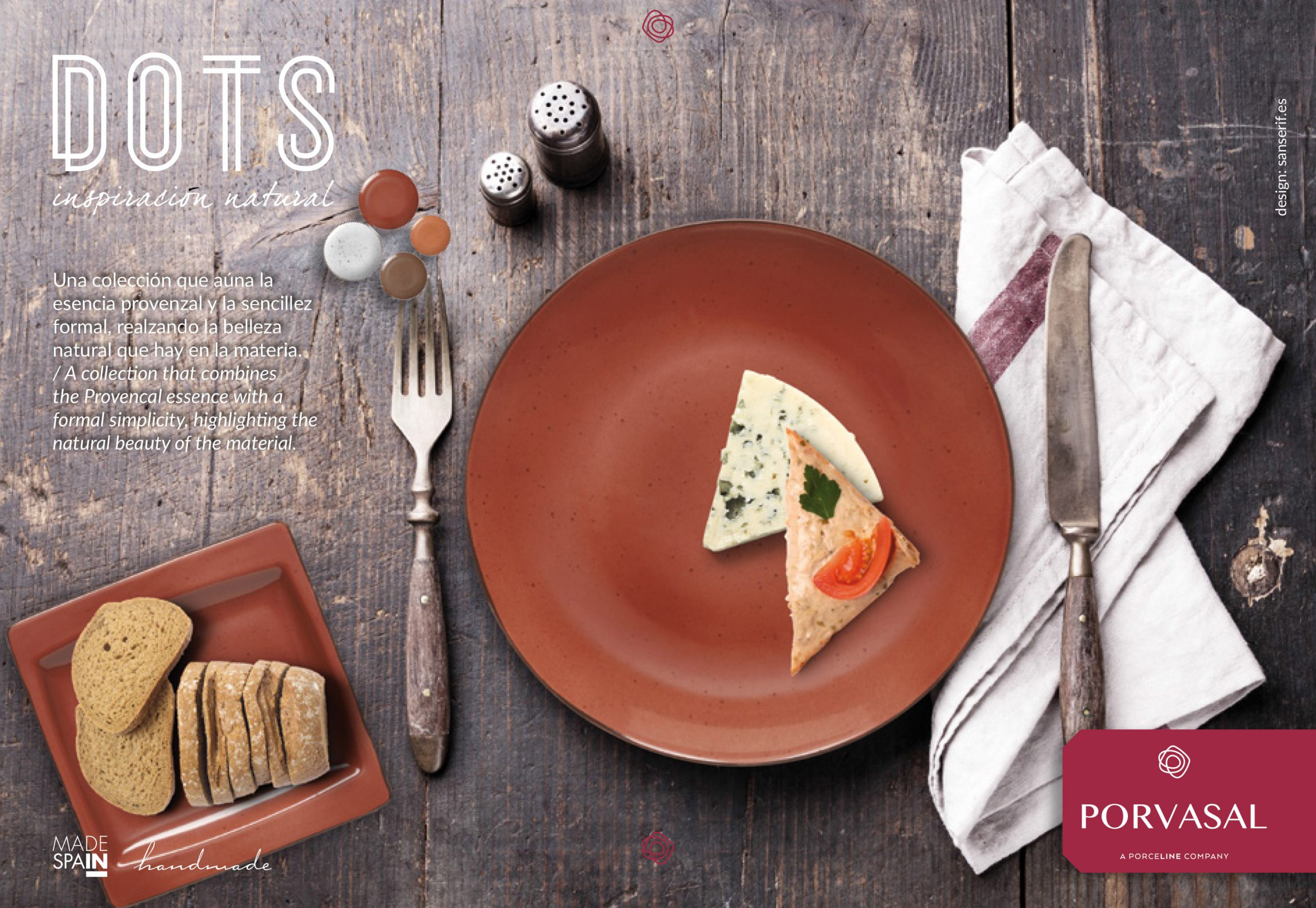 Desde sus iniciales tonalidades Marsala, Tierra, Ámbar y Blanco, esta colección ha evolucionado a una gama amplia para cubrir todo el espectro del mercado. Y las necesidades de sus principales usuarios, los profesionales e la hostelería, gracias a una cuidada selección de 16 piezas en las que recrean un estilo de vida con aroma a campo. Fue un placer colaborar con Porvasal en la creación de esta línea y los promocionales de Dots que, aún hoy, siguen siendo un clásico contemporáneo.