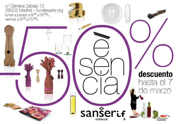 Tras el exito de Esencia by Sanserif Creatius en Madrid (sede Fundesarte en c/general Zabala, 12) y para celebrar que ampliamos estancia hasta el 8 de marzo, Dia Internacional de la Mujer, todos los productos presentes en la exposicion podran adquirirse a un 50% del valor real durante estas dos semanas. Desde Sanserif Creatius queremos unirnos asi a la celebracion de un dia tan importante y tambien compartir con todos la nominación a la séptima edición de los Premios Nacionales de Artesanía, que gestiona la Fundación Española para la Innovación de la Artesanía (Fundesarte), con este proyetco expositivo que pretende abrir nuevas lineas de negocio y mercados a los artesanos españoles. Mas info en Fundesarte o Sanserif.es