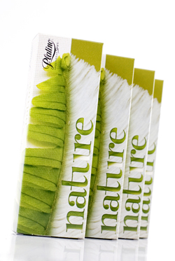 En este caso, la creativa valenciana ha apostado por contenedores de cartoncillo biodegradable y una imagen evocadora de la suavidad del material y el uso de fibras vegetales, en la recreación de una pluma que combina plumas y hojas.