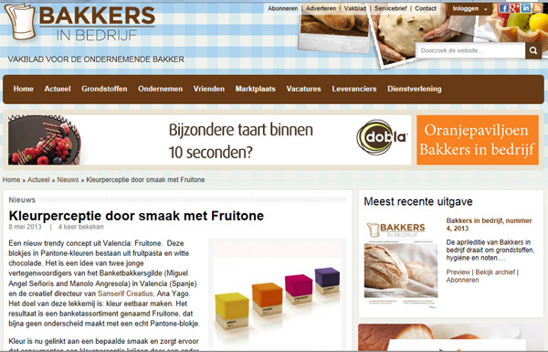 Extract: Een nieuw trendy concept uit Valencia: Fruitone.  Deze blokjes in Pantone-kleuren bestaan uit fruitpasta en witte chocolade. Het is een idee van twee jonge vertegenwoordigers van het Banketbakkersgilde (Miguel Angel Señorís and Manolo Angresola) in Valencia (Spanje) en de creatief directeur van Sanserif Creatius, Ana Yago. Het doel van deze lekkernij is: kleur eetbaar maken. Het resultaat is een banketassortiment genaamd Fruitone, dat bijna geen onderscheid maakt met een echt Pantone-blokje. More info at Bakkers in Bedrijf.