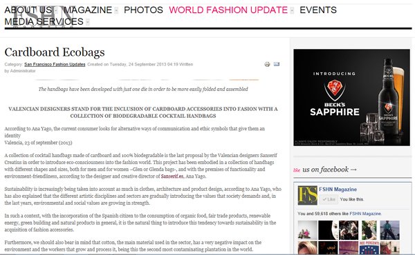Advance: (···) The collection Glen or Glenda has been developed with this philosophy, a project which aim is to “use basic industrial materials in fashion and prêt-a-porter by providing them with added values like sustainability, bearing in mind the purely aesthetic and practical functions”, according to the Valencian designer. Furthermore, cardboard is a material that has been “misjudged and poorly regarded ” and which “possibilities have not been explored yet, what turned it into a challenge”, according to the Valencian creative. “If we get to convince people to use cardboard handbags, the next step will be introducing this material into other everyday areas, from the home sphere to the office, but with an innovative viewpoint” (···) More info at San Francisco Bay Fashion Mag or Sanserif.es