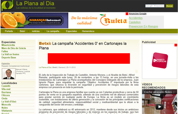 Extracto: La cartonera, que celebrará su 40 aniversario en 2013, mantiene desde sus inicios un ambicioso programa de prevención de riesgos laborales y de mejoras en los espacios de trabajo, que han culminado este año en el programa “Objetivo: Accidentes 0” que, a fecha de hoy, ha permitido que no se registren incidencias en el ejercicio de las diferentes labores industriales y administrativas. Más info en La Plana al Día.