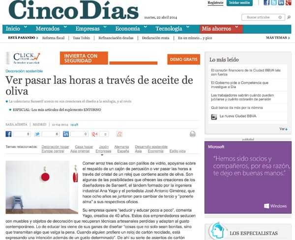 Extracto: (···) Cuentan estos dos emprendedores valencianos que fuera les hacen más caso que en España. A pesar de ser una compañía pequeña, que quiere seguir siéndolo, sus diseños han viajado a Alemania, Italia o Abu Dabi, y conocidos suyos les dicen de cuando en cuando que se han cruzado con sus piezas en otros países. “A veces apetece ponerles un microchip y ver hasta dónde pueden llegar”. Su último trabajo ha sido poner a prueba la conexión entre la tradición artesana japonesa y la española, con motivo del 400 aniversario que Japón y España celebran de sus relaciones diplomáticas en 2013 y 2014. Buscaron similitudes y se sorprendieron al descubrir la fuerza del tratamiento que los japoneses hacen del vidrio con la técnica fusing, o de fusión, en la que el artista y artesano moldea formas con destreza aprovechando el calor sobre este material, también presente en España. Luego llegaron la cerámica, o la seda, incluso las castañuelas, cuadradas en el país nipón, fiel apasionado del flamenco, con excelentes bailadores, entre los pocos fuera de España a los que se les reconoce tener duende pese a la enorme distancia entre las raíces folclóricas de ambos países (···) Más info en el Suplemento Entorno de Cinco Días, reportaje escrito por Sara Acosta.