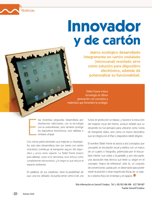 El último número de la revista Corrugando de la Asociación de Corrugadores del Caribe, Centro y Sur América presenta el Tablet Frame de Sanserif Creatius como noticia destacada en portada y en páginas interiores, bajo el titular “Innovador y de cartón”.