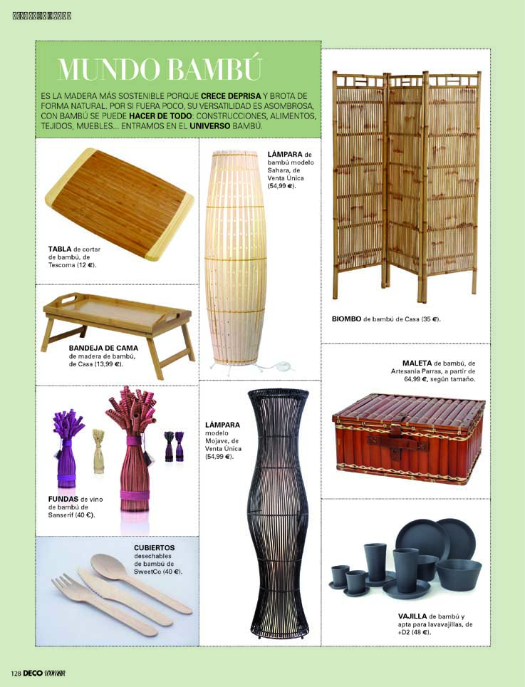 Extracto: (···) Es la madera más sostenible porque crece deprisa y brota de forma natural. por si fuera poco, su versatilidad es asombrosa, con bambú se puede hacer de todo: construcciones, alimentos, tejidos, muebles… entramos en el universo bambú. Con las FUNDAS de vino de bambú de Sanserif.es, 40 € (···) Más info en Deco Woman Shopping
