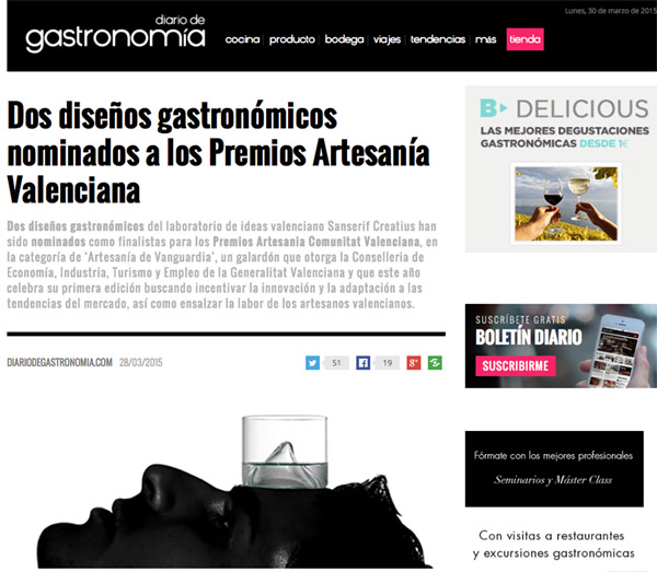 Extracto: (···) Dos diseños gastronómicos del laboratorio de ideas valenciano Sanserif Creatius han sido nominados como finalistas para los Premios Artesania Comunitat Valenciana, en la categoría de ‘Artesanía de Vanguardia’, un galardón que otorga la Conselleria de Economía, Industria, Turismo y Empleo de la Generalitat Valenciana y que este año celebra su primera edición buscando incentivar la innovación y la adaptación a las tendencias del mercado, así como ensalzar la labor de los artesanos valencianos (···) Más info en Diario de Gastronomía