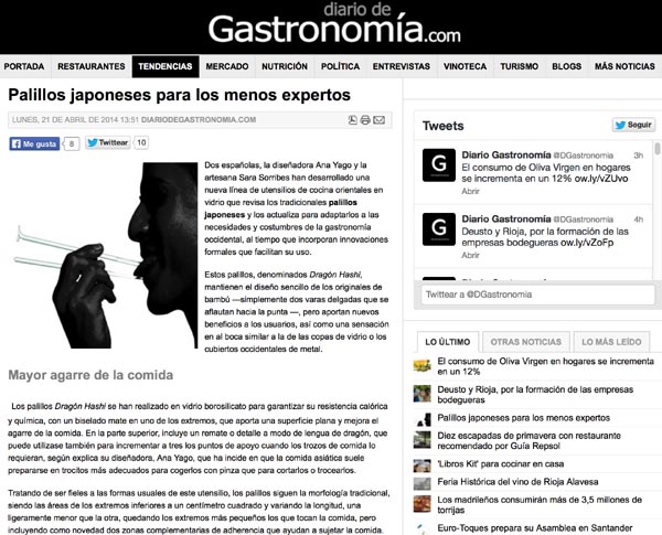 Extracto: (···) Los palillos Dragón Hashi se han realizado en vidrio borosilicato para garantizar su resistencia calórica y química, con un biselado mate en uno de los extremos, que aporta una superficie plana y mejora el agarre de la comida. En la parte superior, incluye un remate o detalle a modo de lengua de dragón, que puede utilizase también para incrementar a tres los puntos de apoyo cuando los trozos de comida lo requieran, según explica su diseñadora, Ana Yago, que ha incide en que la comida asiática suele prepararse en trocitos más adecuados para cogerlos con pinza que para cortarlos o trocearlos (···) Más info en Diario de Gastronomía