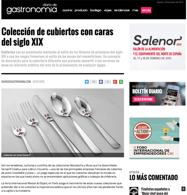 Extracto: (···) Son los tenedores, cucharas y cuchillos de las colecciones Moustache y Musa que ha desarrollado Sanserif Creatius para Lebrun Couverts —una de las tres principales empresas francesas de cubiertos de acero inoxidable y plata—, un juego especular en el que los cubiertos devuelven la mirada en espacios en los que hasta ahora no se encontraban aplicaciones gráficas o trabajos de orfebrería (···) Más info en Diario Gastronomía