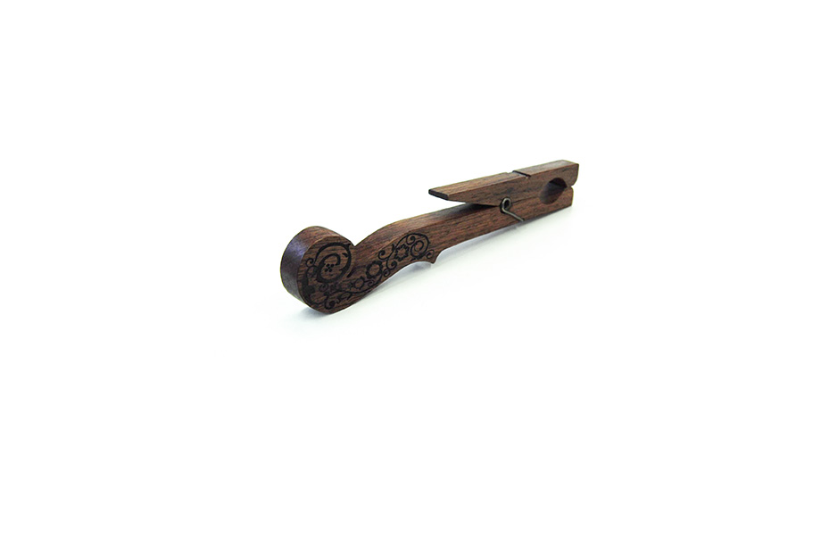 Para ello, se estudiaron las formas de las pinzas decorativas que se usaban en el Medievo y los elementos decorativos que incorporaban, al tiempo que se redimensionaron las formas tradicionales de una pinza de madera, manteniendo la estructura y morfología básica de ésta, compuesta por dos piezas que se presionan para abrirla y se vuelven a cerrar accionadas por una pieza que actúa como muelle. De esta forma, se recupera la usanza de este tipo de herramientas y se sustituye la pinza de ropa por otra más adecuada al contexto y los espacios en los que se disfruta de la música. De hecho, cada scroll-clip se realiza a partir de vetas de madera natural, especialmente palosanto, sobre la que se realiza el tallado a mano o un proceso de barnizado similar al que se aplica a los instrumentos musicales.