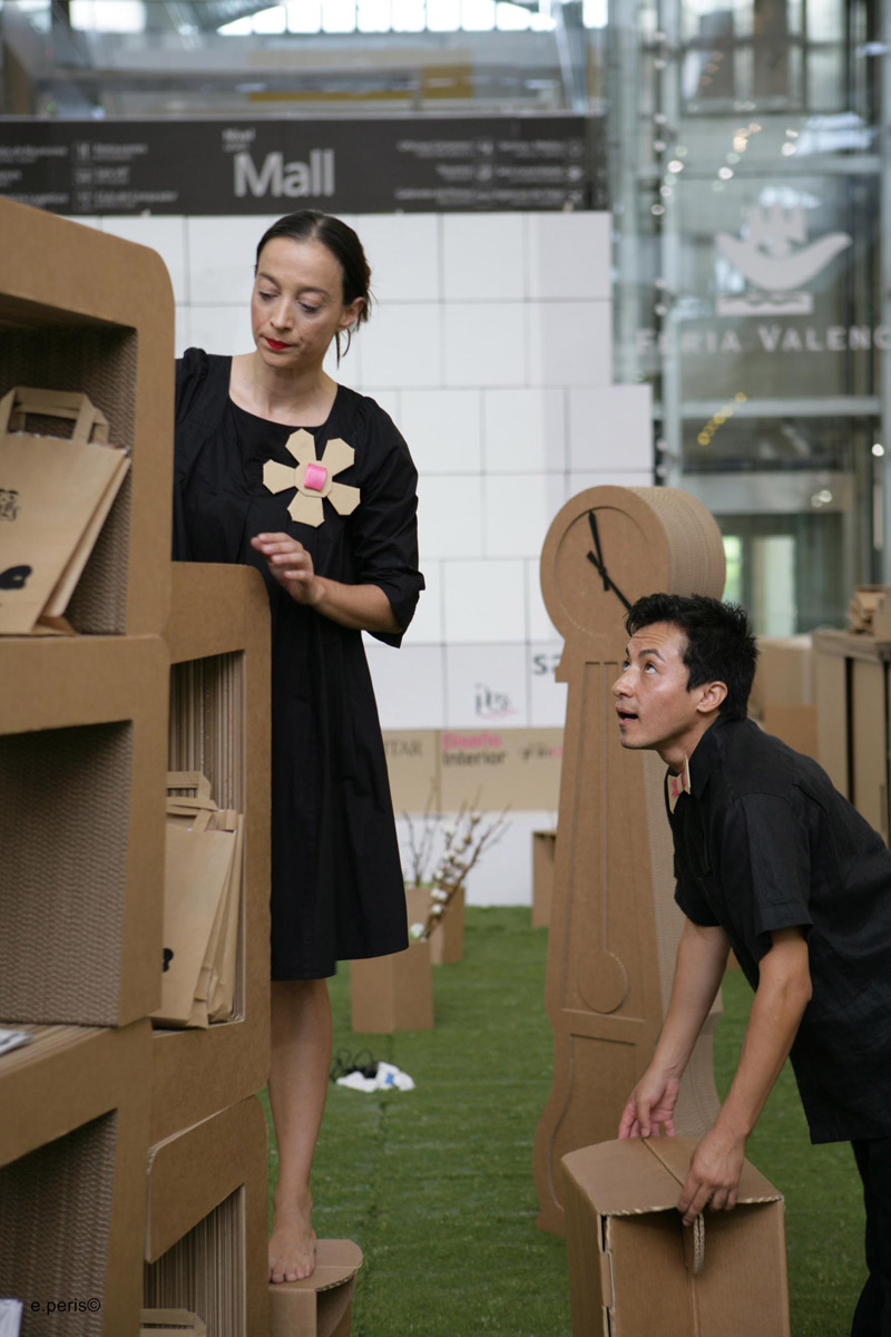 Esta innovadora propuesta expositiva reúne una docena de piezas exclusivas realizadas en cartón ondulado y 100% biodegradables que muestran otra forma de entender el hábitat, desde cómodas con espejo, relojes de pié o asientos con inspiración tipográfica, concebidos por los diseñadores Ana Yago y José Antonio Giménez, en colaboración de la oficina técnica de Grupo La Plana y Feria Hábitat Valencia.