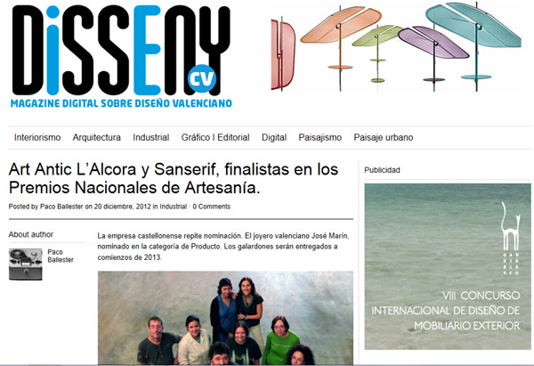 Extracto: El estudio de diseño valenciano Sanserif Creatius (integrado por la diseñadora Ana Yago y el periodista José Antonio Giménez), la empresa castellonense de cerámica artística artesanal Art Antic L’Alcora, y el joyero valenciano José Marín (en la categoría de Producto), han resultado finalistas de la edición 2012 de los Premios Nacionales de Artesanía. Sanserif está englobado en la categoría de Premio Promociona para entidades privadas. El fallo del jurado se dará a conocer en la gala de entrega de premios que tendrá lugar a principios del próximo año. Más info en Dssny CV o Fundesarte