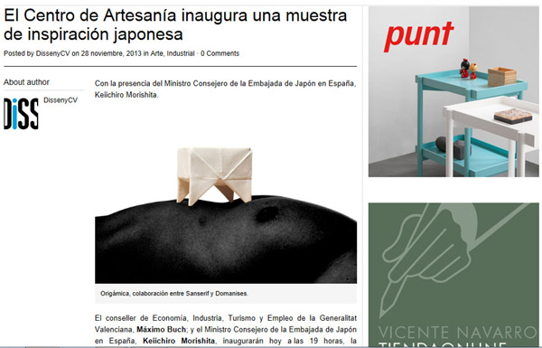 Extracto: “(···) Este proyecto de investigación, que deriva anualmente en una exposición itinerante y que fue galardonado como finalista en la pasada edición de los Premios Nacionales de Artesanía, ha sido elegido para formar parte de los actos culturales oficiales que conmemoran el Año dual España-Japón (···)”. Más info en DssnyCV