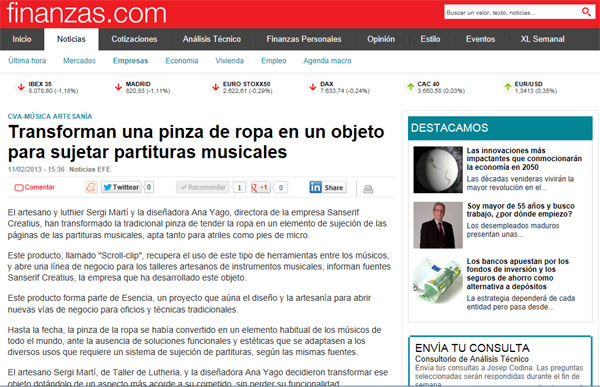 Extracto: Este producto, llamado “Scroll-clip”, recupera el uso de este tipo de herramientas entre los músicos, y abre una línea de negocio para los talleres artesanos de instrumentos musicales, informan fuentes Sanserif Creatius, la empresa que ha desarrollado este objeto. Más info en Finanzas