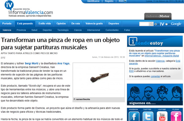 Extracto: El artesano y luthier Sergi Martí y la diseñadora Ana Yago, directora de la empresa Sanserif Creatius, han transformado la tradicional pinza de tender la ropa en un elemento de sujeción de las páginas de las partituras musicales, apta tanto para atriles como pies de micro. Más info en Informa Valencia