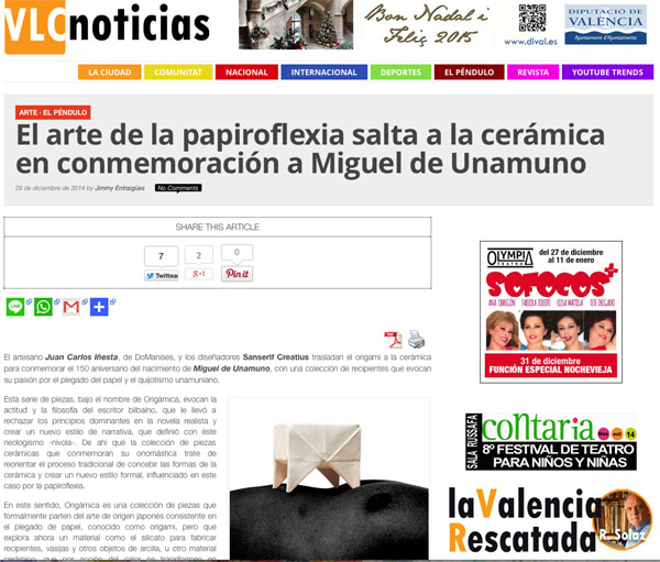 Extracto: (•••) Esta serie de piezas, bajo el nombre de Origámica, evocan la actitud y la filosofía del escritor bilbaíno, que le llevó a rechazar los principios dominantes en la novela realista y crear un nuevo estilo de narrativa, que definió con éste neologismo -nivola-. De ahí que la colección de piezas cerámicas que conmemoran su onomástica trate de reorientar el proceso tradicional de concebir las formas de la cerámica y crear un nuevo estilo formal, influenciado en este caso por la papiroflexia (•••) Más info en VLC Noticias