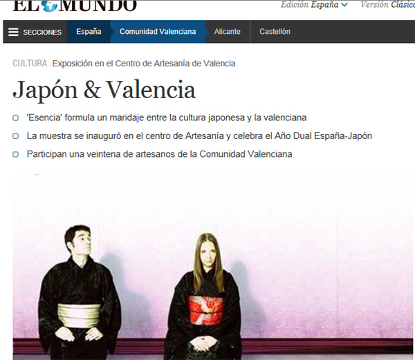Extracto: “(···) Pese a la distancia y las diferencias existen ciertas afinidades entre dos tierras orientadas a Levante que contemplan cada día el ascenso del sol naciente: Japón y Valencia. El consumo de arroz, el amor a los tejidos suntuosos, el uso del abanico y las peinetas, las refinadas cerámicas y porcelanas… Esta sintonía estética se plasma en una curiosa muestra inaugurada ayer en el Centro de Artesanía, Esencia, realizada por el equipo de diseñadores de Sanserif con la participación de una veintena de artesanos de la Comunidad Valenciana. (···)” Más información en El Mundo.