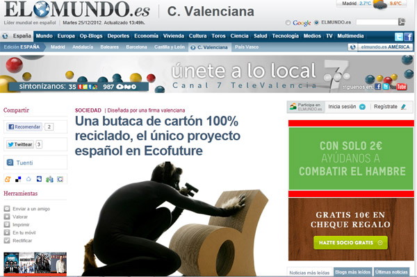 26 Dic El Mundo: Una butaca de cartón 100% reciclado, el único proyecto español en Ecofuture