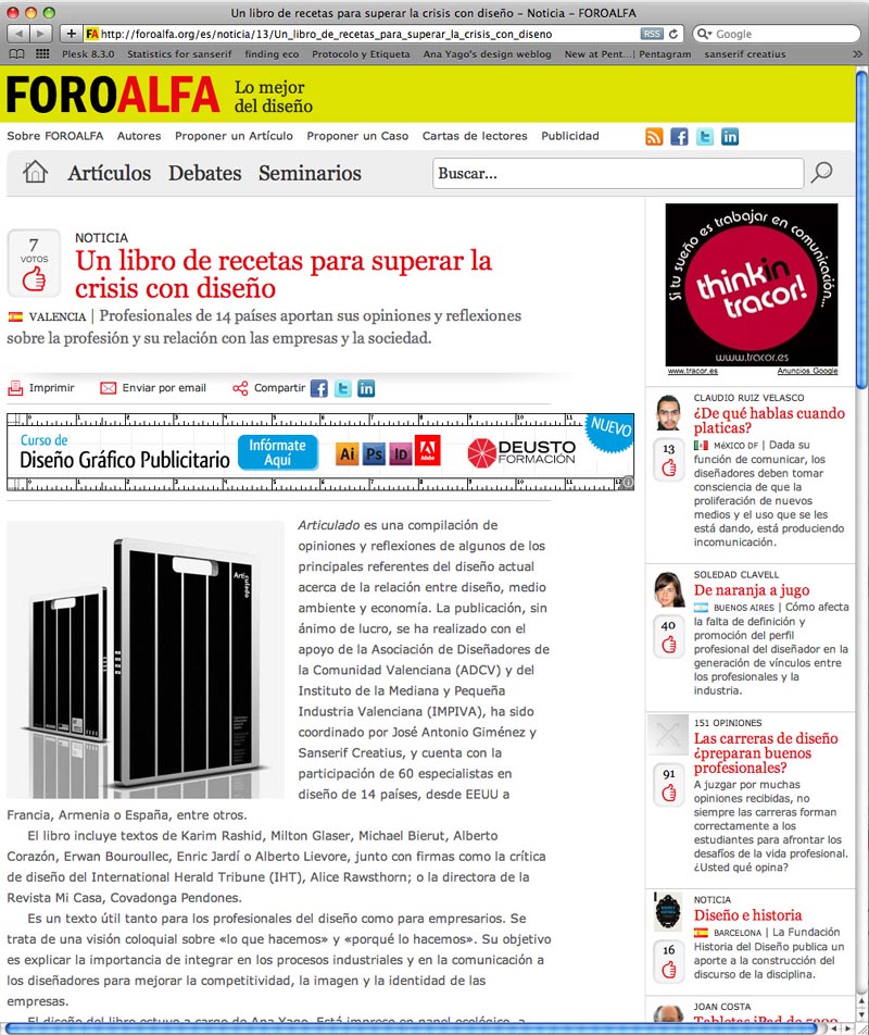 Foro Alfa ha destacado la publicación de Articulado, un libro de recetas para superar la crisis con diseño. La última propuesta editorial de Sanserif Creatius reune ideas y reflexiones de Karim Rashid, Milton Glaser, Michael Bierut, Alberto Corazón, Erwan Bouroullec, Enric Jardí o Alberto Lievore, sobre la relación entre el disñeo, la economía y el medio ambiente.