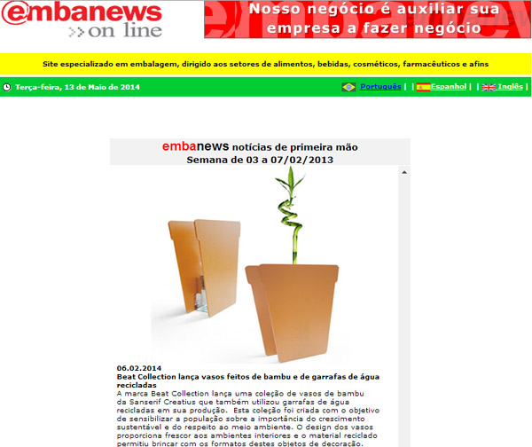 Extracto: (···) A marca Beat Collection lança uma coleção de vasos de bambu da Sanserif Creatius que também utilizou garrafas de água recicladas em sua produção. Esta coleção foi criada com o objetivo de sensibilizar a população sobre a importância do crescimento sustentável e do respeito ao meio ambiente. O design dos vasos proporciona frescor aos ambientes interiores e o material reciclado permitiu brincar com os formatos destes objetos de decoração (···) Más info en Embanews