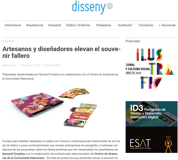 Extract: (···) Tablet cases made of silk with traditional motifs and prints of the fallera costume or contemporary jewelry that recreates some pictograms of “saragüells” (traditional men costume) and “huertanas” (traditional women costume) are some of the proposals for the Fallas festivities that the designers of Sanserif Creatius have developed with the collaboration of selected professionals from the Valencian Community Crafts Centre.  These are products that aim to elevate the Fallas souvenir to a product for sybarites, for consumers who are looking for quality and value the artisan work, says the director of the Sanserif Creatius design studio, Ana Yago, creator of this collection (···)