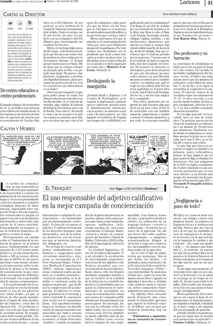The opinion section El Trinquet of the newspaper Levante-EMV publishes an opinion piece by the designers Ana Yago and José Antonio Giménez (Sanserif Creatius) on the importance of using qualifying adjectives in order to raise awareness for the campaigns on violence against women and in general against gender-based violence.