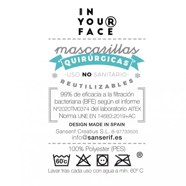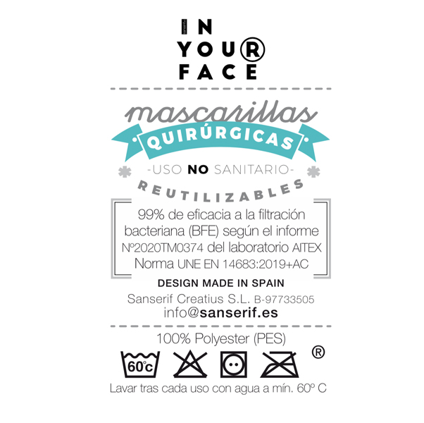 Reusable and washable mask. Designed and Made in Spain. Effectiveness tested in an approved laboratory. No filters needed. Made of 100% polyester to ensure proper breathability.