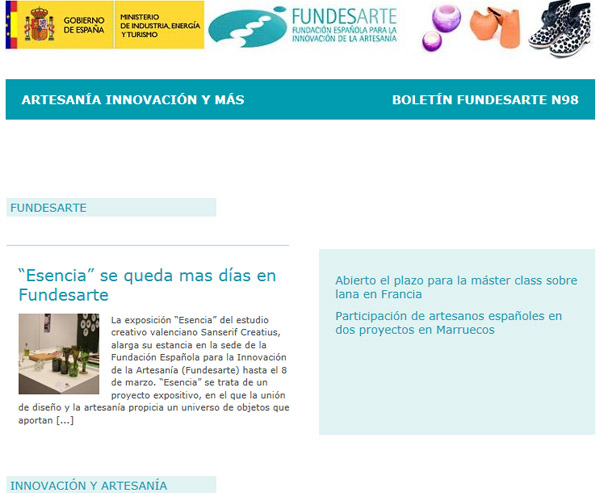 Extracto: La exposición “Esencia” del estudio creativo valenciano Sanserif Creatius, alarga su estancia en la sede de la Fundación Española para la Innovación de la Artesanía (Fundesarte) hasta el 8 de marzo. “Esencia” se trata de un proyecto expositivo, en el que la unión de diseño y la artesanía propicia un universo de objetos que aportan nuevos valores a la sociedad, recuperando técnicas, procesos y materiales tradicionales. Más info en Fundesarte o Sanserif.es