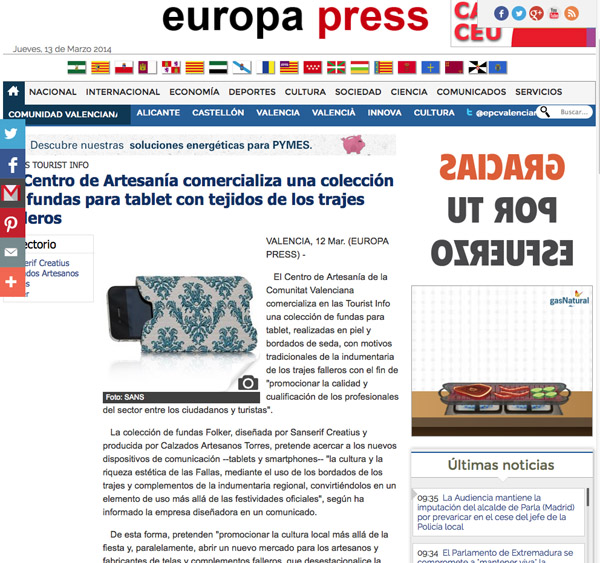 Extracto: (···) La colección de fundas Folker, diseñada por Sanserif Creatius y producida por Calzados Artesanos Torres, pretende acercar a los nuevos dispositivos de comunicación –tablets y smartphones– “la cultura y la riqueza estética de las Fallas, mediante el uso de los bordados de los trajes y complementos de la indumentaria regional, convirtiéndolos en un elemento de uso más allá de las festividades oficiales”, según ha informado la empresa diseñadora en un comunicado (···) Más info en Europa Press