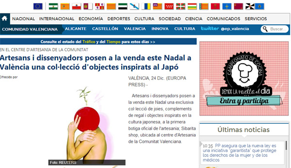 Extracte: “(···) Artesans i dissenyadors posen a la venda este Nadal una exclusiva col·lecció de joies, complements de regal i objectes inspirats en la cultura japonesa, a la primera botiga oficial de l’artesania; Sibarita shop, ubicada al centre d’Artesania de la Comunitat Valenciana. (···)” Más info en Europa Press