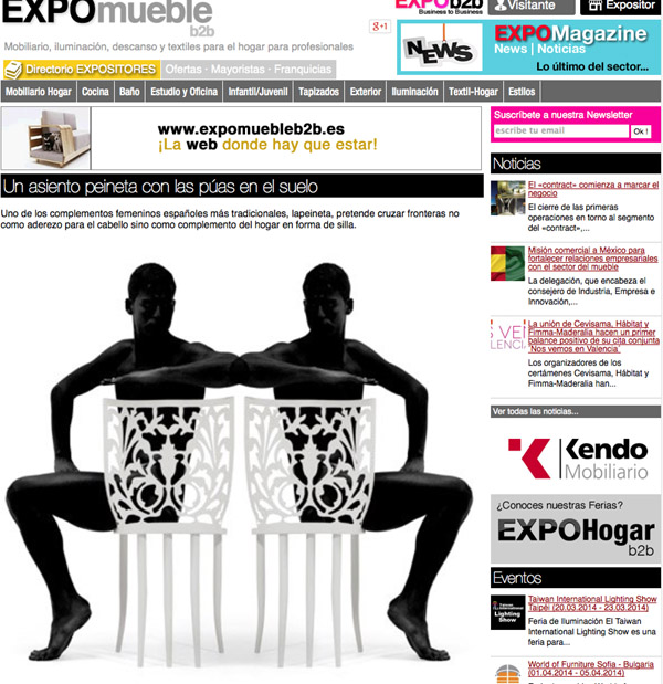 Extracto: (···)“Kushi Chair” -silla peineta- es el innovador asiento, realizado artesanalmente en forma de peineta flamenca, una idea del equipo de la diseñadora Ana Yago que espera convertir en “icono” a partir del ornamento femenino con fuertes raíces español. La pieza está realizada por los artesanos castellonenses Deferro y tiene como objetivo acercar la capacidad técnica de los creadores y artesanos españoles a nuevos mercados internacionales, donde están muy presente algunos referentes folklóricos españoles (···) Más info ExpoMueble