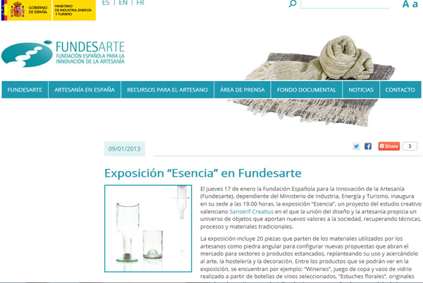 Extracto: El jueves 17 de enero la Fundación Española para la Innovación de la Artesanía (Fundesarte), dependiente del Ministerio de Industria, Energía y Turismo, inaugura en su sede a las 19.00 horas, la exposición “Esencia”, un proyecto del estudio creativo valenciano Sanserif Creatius en el que la unión del diseño y la artesanía propicia un universo de objetos que aportan nuevos valores a la sociedad, recuperando técnicas, procesos y materiales tradicionales. Más info en Fundesarte