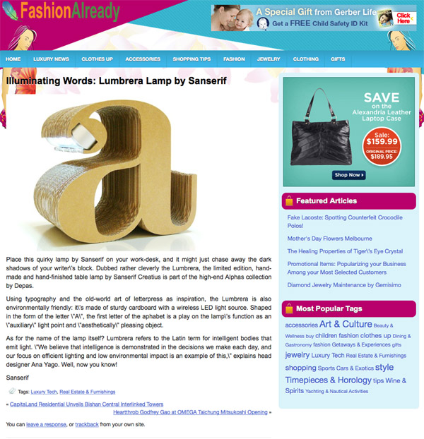 Extract: (···) Place this quirky lamp by Sanserif on your work-desk, and it might just chase away the dark shadows of your writer\’s block. Dubbed rather cleverly the Lumbrera, the limited edition, hand-made and hand-finished table lamp by Sanserif Creatius is part of the high-end Alphas collection by Depas (···) More info at Fashion Already