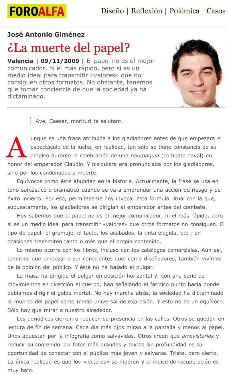 12 Nov Foro Alfa destaca esta semana el artículo ¿La muerte del papel? del director de comunicación de Sanserif Creatius