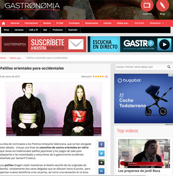 Extracto: (···) Los palillos están realizados en vidrio borosilicato para garantizar su resistencia calórica y química, con un biselado mate en uno de los extremos, que aporta una superficie plana y mejora el agarre de la comida. En la parte superior, incluye un remate o detalle a modo de lengua de dragón, que puede utilizase también para incrementar a tres los puntos de apoyo cuando los trozos de comida lo requieran, según ha explicado Ana Yago, directora de Sanserif Creatius (···) Más info en Gastronomía.com