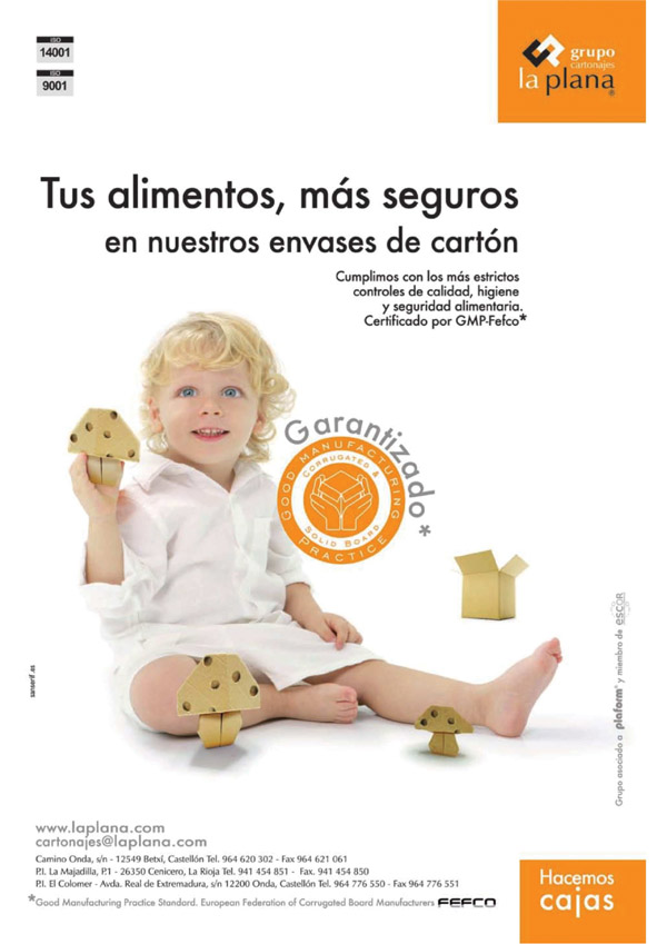 El Grupo La Plana mantiene un crecimiento constante en el sector alimentarios gracias los envases de cartón seguros en los últimos años. Una línea de producto por la que han apostado fuertemente convirtiéndose en una de las primeras compañías españolas dedicadas al envase y embalaje de cartón ondulado en obtener un certificado europeo Good Manufacturing Practice Standard (GMP) de la European Federation of Corrugated Board Manufacturers (FEFCO).