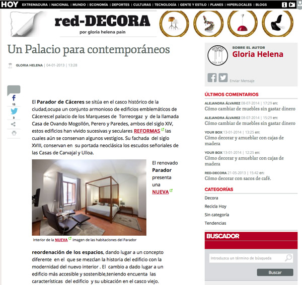 Extracto: (•••) Cuando paseamos por sus laberínticas estancias ,vemos como el granito, el barro y la madera se unen en armoniosos y NUEVOS espacios acogedores,que de ellos se han conservado los techos de madera en los salones, los sobrios ventanales o los muebles de maderas nobles combinándolos con piezas contemporáneas y respetando siempre el ambiente histórico del edificio.Algunos de los muebles utilizados para la decoración son los asientos de cartón diseñados por Ana Yago, piezas que se mezclan con sillones y SOFÁS minimalistas con aire de los años ‘50, LÁMPARAS DE PIÉ italianas, sistemas hi-tech de iluminación de BAJO consumo, calderas de alto rendimiento, y sistemas para el CONTROL de la climatización (•••) Más info en Hoy Extremadura