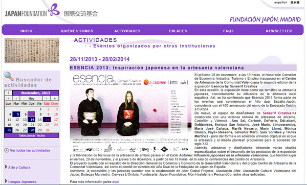 La Fundación Japón de Madrid, cuya labor y estructura es similar a la red de centros del Instituto Cervantes, es una de las instituciones que han decidido respaldar la exposición Esencia by Sanserif Creatius, inspiración japonesa en la artesanía valenciana y las jornadas Ciclo Autores: Influencia japonesa en la artesanía valenciana, eventos que forman parte de las actividades culturales oficial de conmemoración del Año Dual España-Japón. Más información en Japan Foundation.