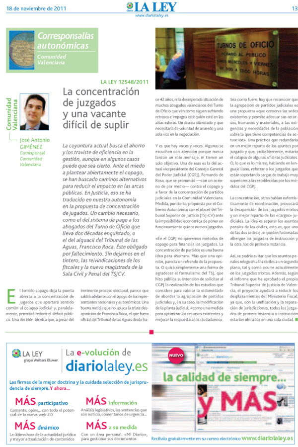 Extracto: El temido copago deja la puerta abierta a la concentración de jugados que aportará sentido común al colapso judicial y, paralelamente, permitirá reducir el déficit público. Una decisión técnica que, a pesar del inminente proceso electoral, parece que saldrá adelante con el apoyo de los representantes nacionales y autonómicos. Una buena noticia que no aplaca la triste desaparición de Francisco Roca, el que fuera oficial del Tribunal de las Aguas desde hace 42 años, ni la desesperada situación de muchos abogados valencianos del Turno de Oficio que ven como siguen sufriendo retrasos e impagos esté quién esté en las altas esferas. Un drama silenciado y que necesitaría de voluntad de acuerdo y una sola voz en la negociación. Más información en Diario La Ley.