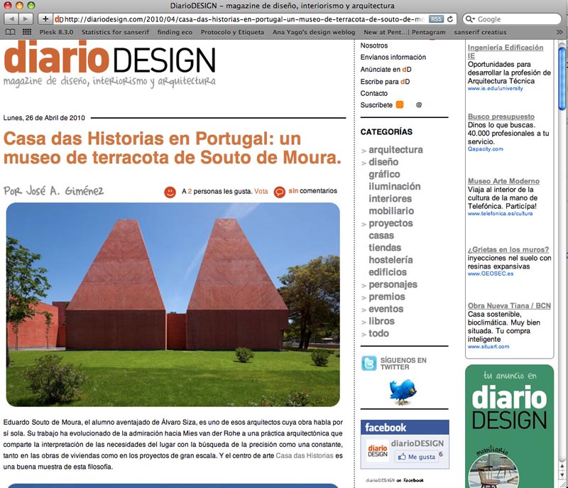 La editora de diarioDESIGN, Gracia Cardona, puso sobre la pista del trabajo del arquitecto portugés Eduardo Souto de Moura al director de comunicación de Sanserif Creatius y columnista invitado de este magazine, José Antonio Giménez. El resultado; el descubrimiento de la Casa das historias, un museo de terracota obra del alumno aventajado de Álvaro Siza. Naturaleza y tecnificación en perfecta armonía.