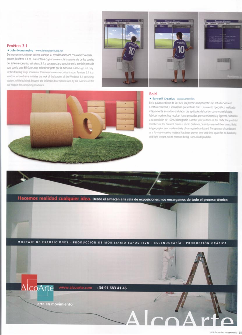 Texto de la noticia: En la Pasada edición de la FIMV, los jóvenes componentes del estudio Sanserif Creatius (Valencia, España) han presentado Bold. Un asiento tipográfico realizado íntegramente en cartón ondulado. Las aptitudes del cartón como material para fabricar muebles hoy resultan harto probadas, por su resistencia y ligereza, sumadas a su condición de 100% biodegradable.