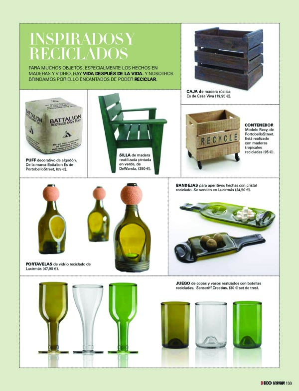 Inspirados y reciclados. Una magnífica forma de resumir la colección de copas y vasos Wineries de Sansenrif Creatius, un complemento decorativo para la mesa surgido de los envases de los vinos seleccionados de la Denominación de Origen Utiel Requena, procesados uno a uno en el taller de Sara Sorribes. Como sugiere, Cristina Bisbal, ara muchos objetos, especialmente los hechos en maderas y vidrio, hay vida después de la vida. Y nosotros brindamos por ello encantados de poder reciclar.