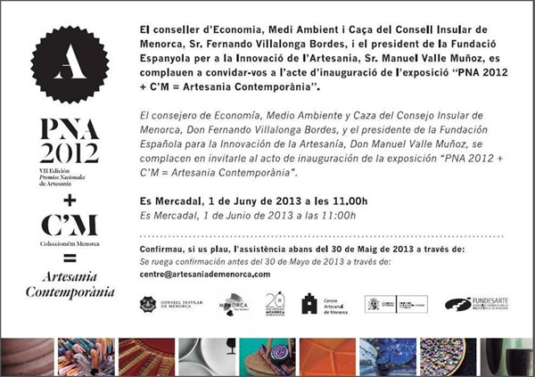 El presidente de la Fundación Española para la Innovación de la Artesanía (Fundesarte), Manuel Valle; y el consejero de Economía de Menorca, Fernando Villalonga, serán los encargados de inaugurar la exposición temporal de los Premios Nacionales de Artesanía 2012 en las Islas Baleares. La muestra reúne los premios seleccionados y finalistas de la última edición de estos galardones, entre los que hay tres piezas desarrolladas por Sanserif Creatius con diversos artesanos.