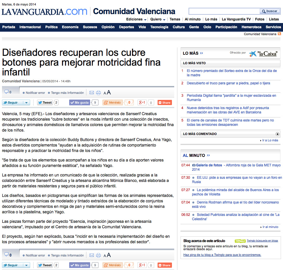 18 May La Vanguardia: Diseñadores recuperan los cubre botones para mejorar motricidad fina infantil