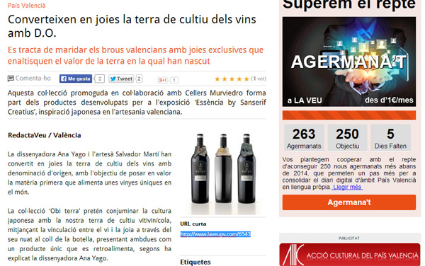 Extracte: “(···) La col·lecció ‘Obi terra’ pretén conjuminar la cultura japonesa amb la nostra terra de cultiu vitivinícola, mitjançant la vinculació entre el vi i la joia a través del seu nuat al coll de la botella, presentant ambdues com un producte únic que es retroalimenta, segons ha explicat la dissenyadora Ana Yago. (···)” Más info en La Veu