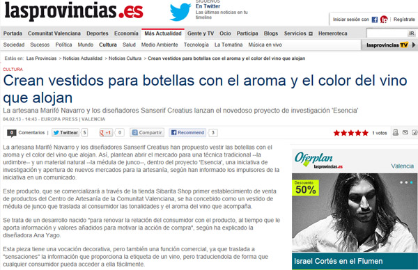 Extracto: Este producto, que se comercializará a través de la tienda Sibarita Shop primer establecimiento de venta de productos del Centro de Artesanía de la Comunitat Valenciana, se ha concebido como un vestido de médula de junco que traslada al consumidor las tonalidades y el aroma del vino que acompaña. Se trata de un desarrollo nacido “para renovar la relación del consumidor con el producto, al tiempo que le aporta información y valores añadidos para motivar la acción de compra”, según ha explicado la diseñadora Ana Yago. Más info en Las Provincias o en Sanserif.es