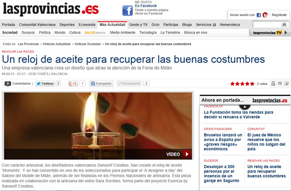 Extracto: Con carácter artesanal, los diseñadores valencianos Sanserif Creatius, han creado el reloj de aceite ‘Moments’. Y se han convertido en uno de los seleccionados para participar el ‘A designer a day’ del Salone del Mobile de Milán, además de ser finalistas en los Premios Nacionales de artesanía. Esta pieza realizada en colaboración con la artesana del vidrio Sara Sorribes, forma parte del proyecto Esencia by Sanserif Creatius. Más info en Las Provincias.