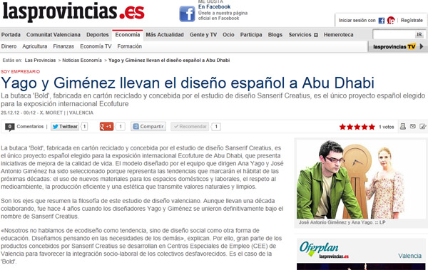 Extracto: La butaca ‘Bold’, fabricada en cartón reciclado y concebida por el estudio de diseño Sanserif Creatius, es el único proyecto español elegido para la exposición internacional Ecofuture de Abu Dhabi, que presenta iniciativas de mejora de la calidad de vida. El modelo diseñado por el equipo que dirigen Ana Yago y José Antonio Giménez ha sido seleccionado porque representa las tendencias que marcarán el hábitat de las próximas décadas: el uso de nuevos materiales para los espacios domésticos y laborales, el respeto al medioambiente, la producción eficiente y una estética que transmite valores naturales y limpios. Más info en Las Provincias