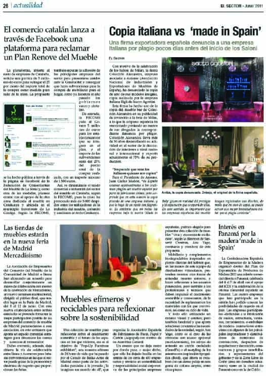 En el último del periódico El Sector del Mueble y la Madera se recoge un artículo sobre esta acción de concienciación desarrollada por los diseñadores valencianos Sanserif Creatius, en la que se ha presentado una colección de muebles efímeros y reciclables para reflexionar sobre la sostenibilidad y las posibilidad de crecimiento sostenible en la industria del hábitat.