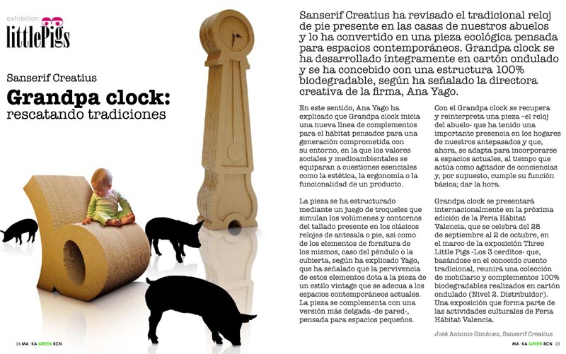 Grandpa clock se presentará internacionalmente en la próxima edición de la Feria Hábitat Valencia, que se celebra del 28 de septiembre al 2 de octubre, en el marco de la exposición Three Little pigs -Los 3 cerditos- que, basándose en el conocido cuento tradicional, reunirá una colección de mobiliario y complementos 100% biodegradables realizados en cartón ondulado (Nivel 2. Distribuidor). Una exposición que forma parte de las actividades culturales de Feria Hábitat Valencia.